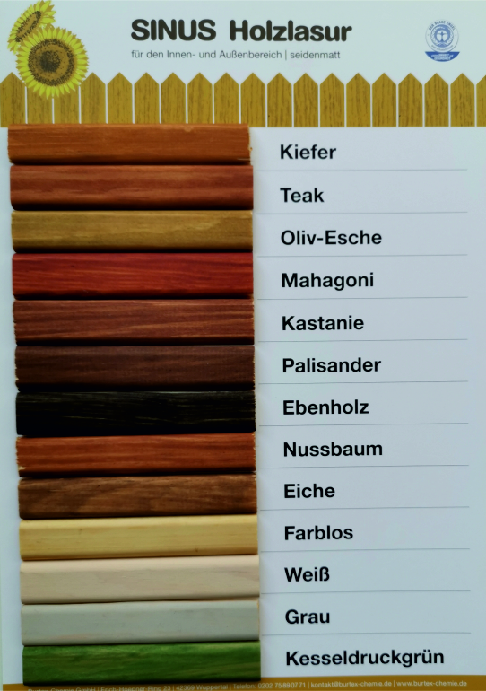 Sinus Holzlasur ist ein wetterfester auf ungesättigten Pflanzenölen basierender Anstrich für Hölzer im Innen- und Außenbereich.