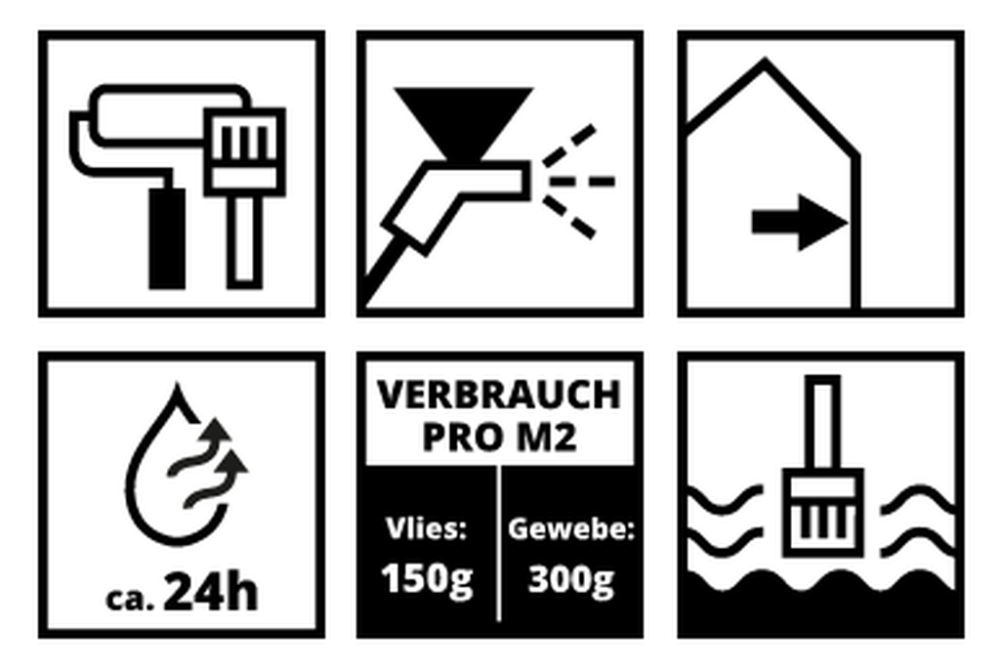 Zur Verklebung von Glasfasergewebe und Vlies Gewebe-Kleber in 2 - 3 Bahnenbreiten, mit einer kurzschurigen Lammfellrolle auf den Untergrund in ausreichender Menge, auf das Dessin abgestimmt, gleichmäßig auftragen.