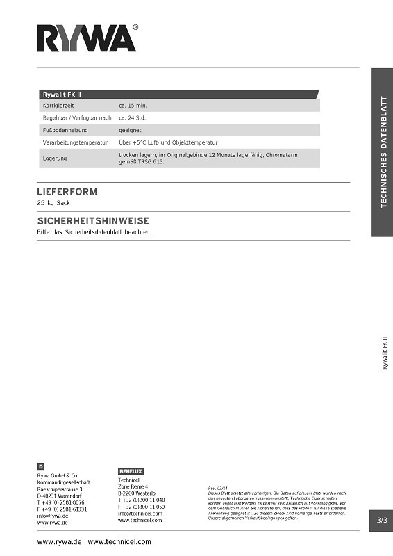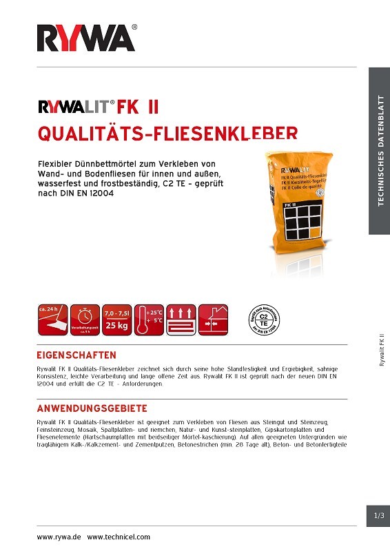 Rywalit FK II Qualitäts-Fliesenkleber zeichnet sich durch seine hohe Standfestigkeit und Ergiebigkeit, sahnige Konsistenz, leichte Verarbeitung und lange offene Zeit aus. Rywalit FK II ist geprüft nach der neuen DIN EN 12004 und erfüllt die C2 TE - Anforderungen.