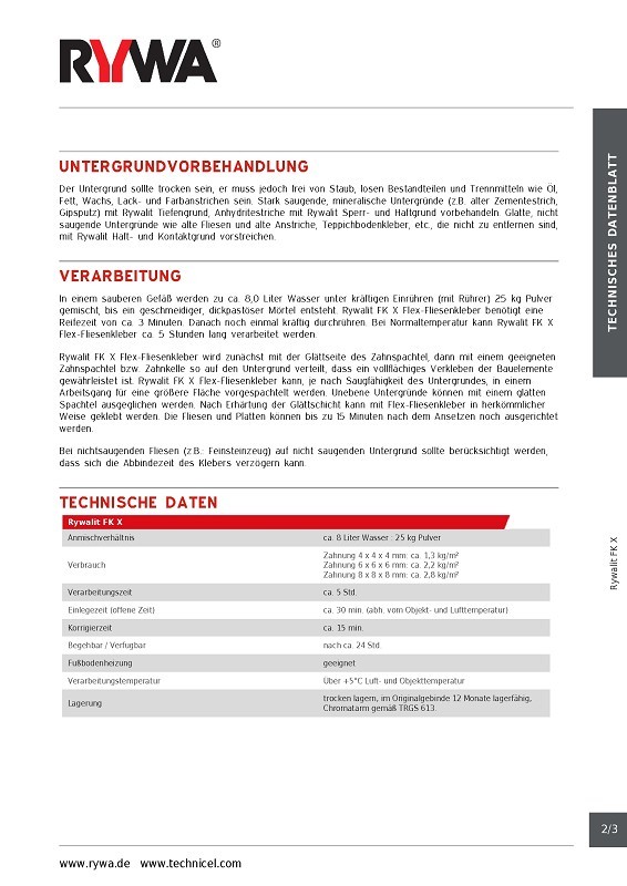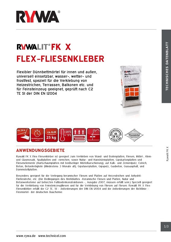 Rywalit® FK X Flex-Fliesenkleber ist geeignet zum Verkleben von Wand- und Bodenplatten, insbesondere Feinsteinzeugfliesen, Mosaik und Glasmosaik, Spaltplatten und -riemchen, sowie verfärbungs- und verformungsunempfindliche Natur- und Kunststeinplatten.