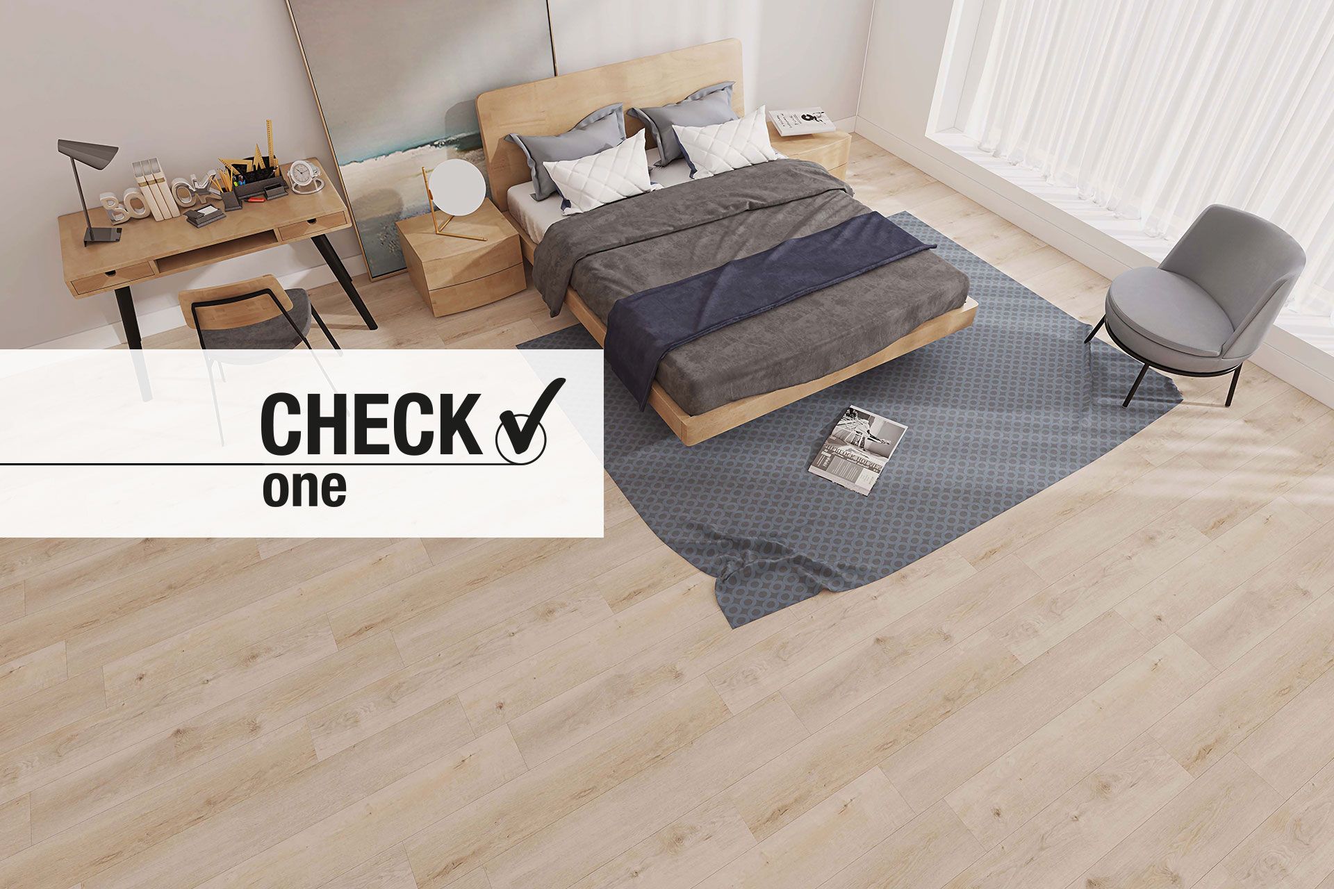 4,5 mm Click-Vinyl CHECK One 2461 Buchrasen Eiche Breitdiele inkl. Trittschall Basic VPE: 2,782 m²Breitdiele, keine Fuge, Strukturprägung, NK 32. Stärke 4,5 mm. VPE: 2,782 m².Hatten Parkett und Laminat vor einigen Jahren noch die Nase vorn, so lässt sich nun ein anderer Trend erkennen. Vinyl überzeugt nicht nur gestalterisch und funktionell, sondern auch im Hinblick auf die Wohngesundheit.Die Trägerplatten von CHECK one sind nämlich weichmacherfrei. Vor allem Renovierer und Modernisierer wissen die Vorteile des Vinyls zu schätzen. Dank der geringen Aufbauhöhe und der einfach anzuwendenden Click-Systeme sind Bad, Küche, aber auch Wohn-, Schlaf oder Kinderzimmer im Nu selbst verlegt.Weil CHECK one über eine härtere Trägerplatte verfügt, kann es auch an Orten verlegt werden, wo herkömmlicher Vinylboden durch Hitze weich werden könnte, zum Beispiel an bodentiefen Fenstern oder in Wohnwintergärten (gemäß Herstellerfreigabe).Eine Gewöhnung des Materials an das Raumklima vor Verlegung ist nicht notwendig. Hinzu kommt, dass Vinylböden fußwarm, robust und sehr pflegeleicht sind. Im Vergleich zu Echtholz verkratzen sie weniger schnell und stark. Vinylbodenbeläge von CHECK sind sehr strapazierfähig und eigenen sich daher nicht nur für die private, sondern auch für die gewerbliche Nutzung.Außerdem sind die Böden für Feuchträume und Fußbodenheizungen geeignet (gemäß Herstellerfreigabe) und können problemlos gesaugt und feucht gewischt werden.Hausstaubmilbenallergiker wissen die effektive und einfache Reinigung zu schätzen. Optisch und haptisch überzeugt CHECK durch seine realistischen Dekorbilder, wodurch der Boden einem echten Holzboden sehr nah kommt und dem Raum ein authentisches, wohliges Flair verschafft.BASIC COLLECTION Breitdiele mit integrierter TrittschallunterlageDurch ihre besondere Oberflächenstruktur und warme Eichenoptik wirken die Breitdielen der CHECK one Basic Collection authentisch und lassen den Raum weitläufiger erscheinen.Durch die integrierte Trittschallunterlage werden eine unkomplizierte und schnelle Verlegung, sowie ein leises Raumklima gewährleistet.Die Breitdielen sind im Format 1220 mm x 228 mm mit einer Stärke von 4,5 mm und einer Nutzungsklasse von 32 erhältlich.Damit eignen sie sich hervorragend für die mittlere gewerbliche NutzungProduktinformationen:Format: BreitdieleFugenbild: keine FugeOberflächenstruktur: StrukturprägungLänge: 1220Breite: 228Nutzschicht Vinyl: 0,2 mmStärke: 4,5Produkttyp: VinylClicksystem: Loc-ClickGarantie priv.: 15 Jahre private GarantieGarantie gew.: 15 Jahre gewerbliche Garantie