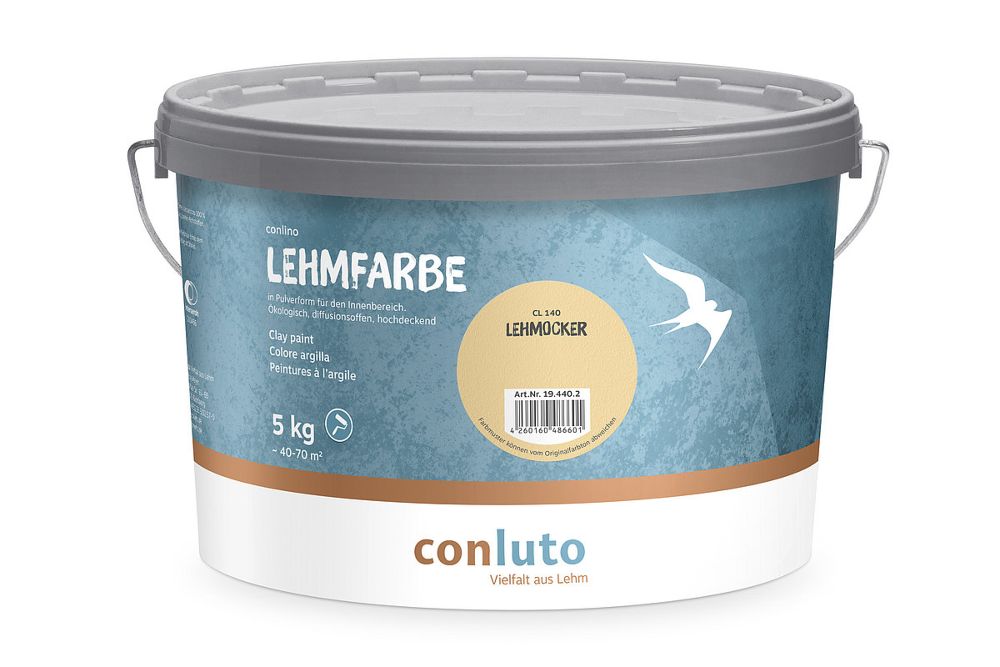 conluto Lehmfarbe ist ein wasserlöslicher, mit Pflanzenstärke und Zellulose stabilisierter Lehmbaustoff für hochdeckende, ökologische Farbanstriche, mit gutem Füllvermögen. Sie bildet eine tuchmatte Oberfläche, ist hoch diffusionsoffen und unterstützt so die Regulierung der Luftfeuchtigkeit. Eine natürliche und sehr leichte Wolkigkeit zeichnet die conluto Lehmfarbe aus, diese kann je nach Verarbeitung variieren.