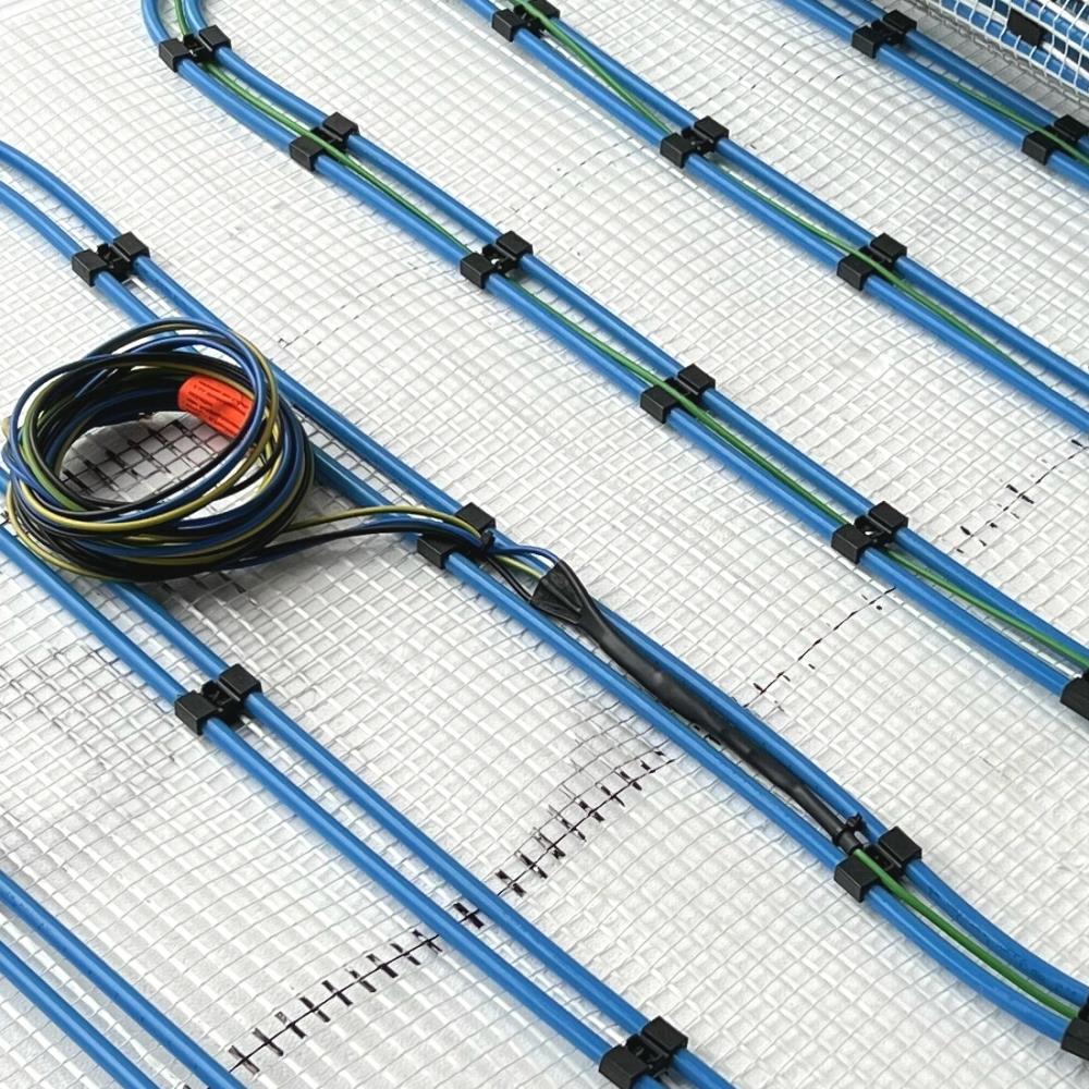 Die Zuleitung (Kaltleiteranschlüsse) der Elektroheizung sind pro Matte ca. 4 m lang und können bis zur Markierung an der Matte nach Bedarf gekürzt oder verlängert werden.