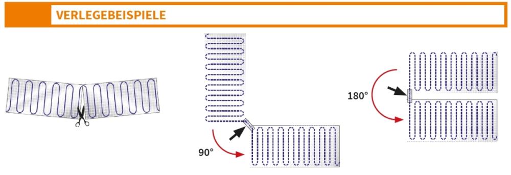 Nicht verfügbare "Zwischenflächen" (z.B. 13 m²) erhält man durch die Kombination von 2 oder mehreren unterschiedlicher Matten, wobei die Auswahl beliebig (z.B. 5 + 8 m²; 10 +3 m²; 3 + 2+ 8 m² usw.) erfolgen kann. Bei der Berechnung sind der maximal zulässige Gesamtstrom des genutzten Stromkreises (Zuleitungsquerschnitte und Abschaltstrom des Leitungsschutzschalter) und des jeweiligen Regelgerätes unbedingt zu beachten.