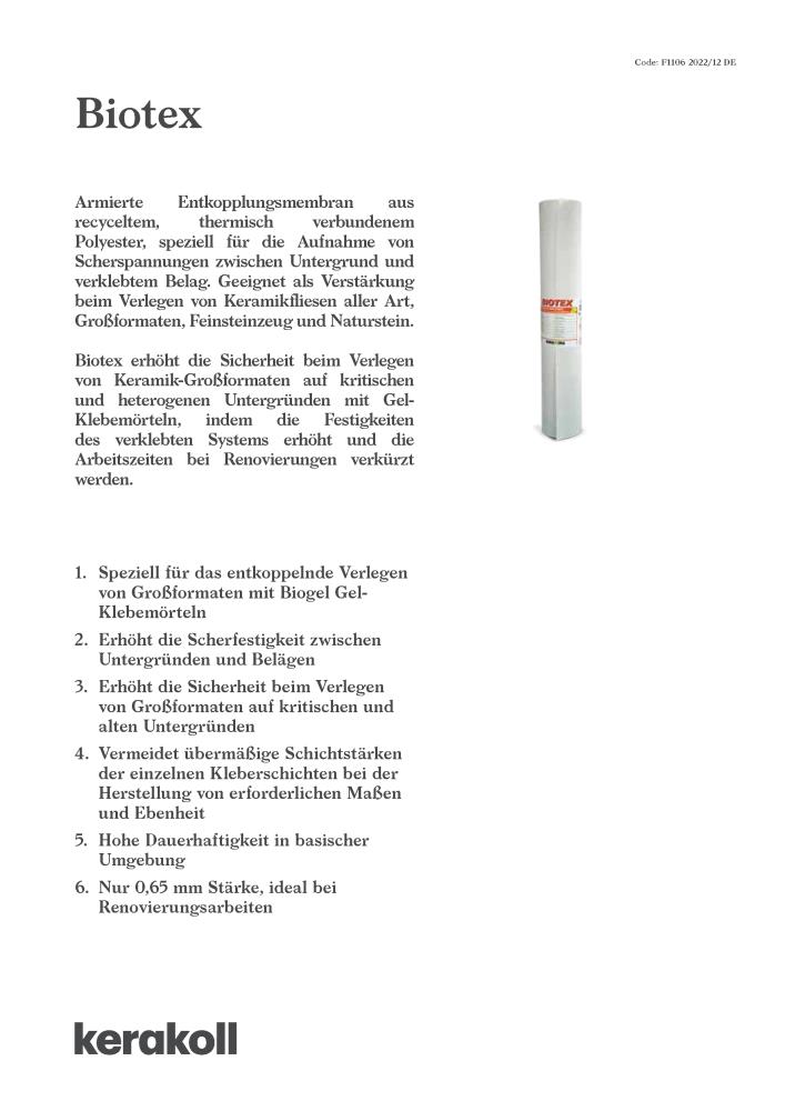 - Beschreibung Kerakoll Biotex Entkopplungsmembran Entkopplungsmatte innen & außen 1 x 50 mGeeignet als Verstärkung beim Verlegen von K… Mehr