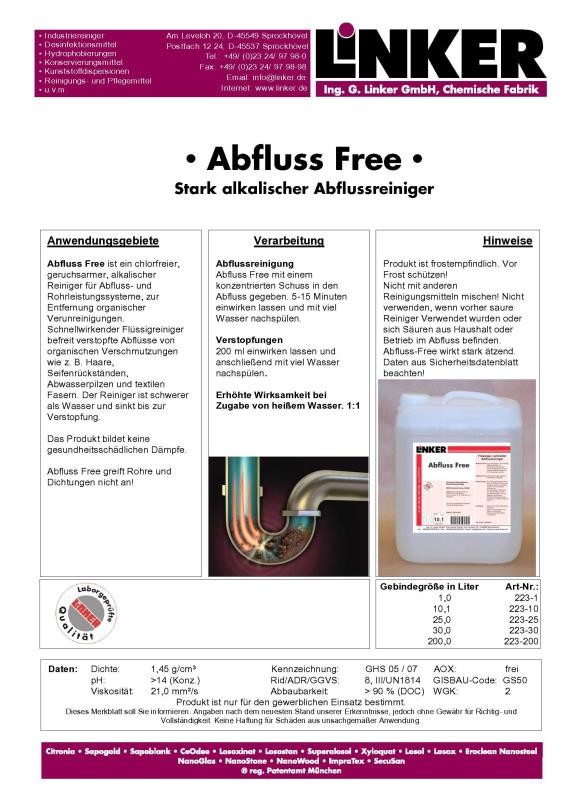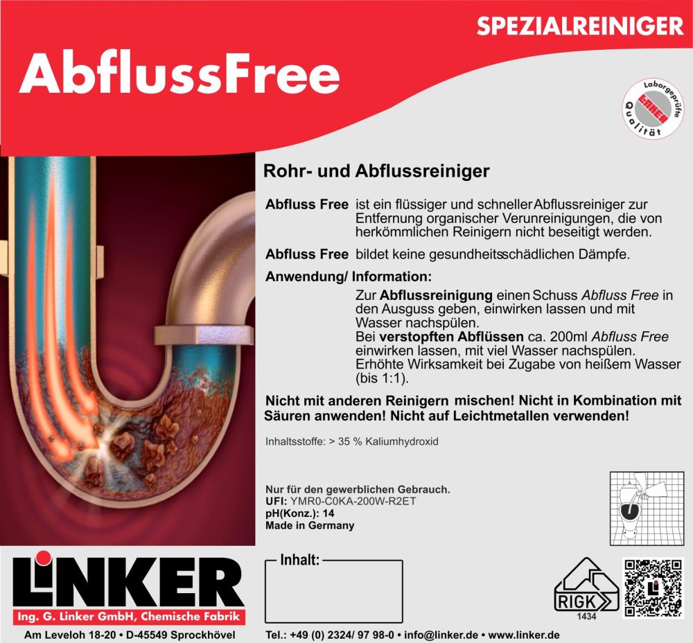 Abfluss Free ist ein chlorfreier, geruchsarmer, alkalischer Reiniger für Abfluss- und Rohrleistungssysteme, zur Entfernung organischer Verunreinigungen. Schnellwirkender Flüssigreiniger befreit verstopfte Abflüsse von organischen Verschmutzungen wie z. B. Haare, Seifenrückständen, Abwasserpilzen und textilen Fasern. Der Reiniger ist schwerer als Wasser und sinkt bis zur Verstopfung. Das Produkt bildet keine gesundheitsschädlichen Dämpfe. Abfluss Free greift Rohre und Dichtungen nicht an!