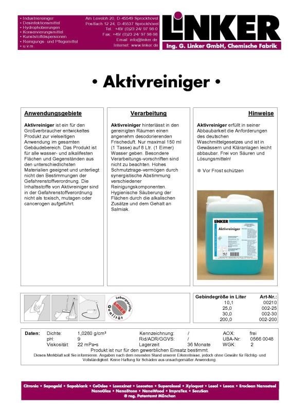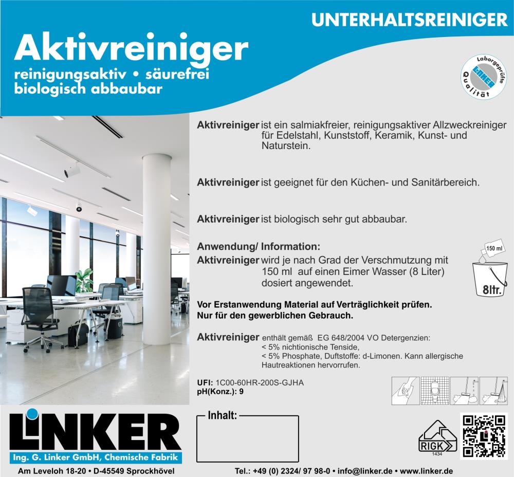 - Beschreibung Linker Chemie Aktivreiniger Gebäude- Küchen- und Sanitärreiniger 10,1 LiterReinignungsprodukt für den gesamten Gebäudebereic… Mehr