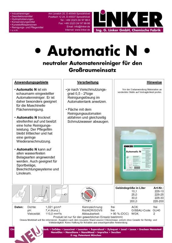 - Beschreibung Linker Chemie Automatic N Wischpflege neutraler Automatenreiniger 10,1 LAutomatic N kann auf allen wasserfesten Belagsarten… Mehr