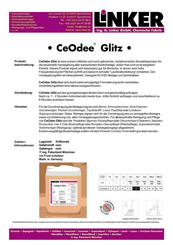 - Beschreibung Linker Chemie CeOdee® Glitz Versiegelung 10,1 Liter CeOdee Glitz ist eine extrem trittfeste und hoch glänzende, metallvernet… Mehr