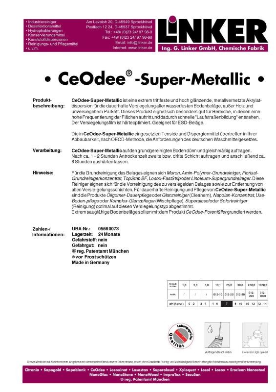 CeOdee-Super-Metallic ist eine extrem trittfeste und hoch glänzende, metallvernetzte Akrylat-Dispersion für die dauerhafte Versiegelung aller wasserfesten Bodenbeläge, außer Holz und unversiegeltem Parkett. Dieses Produkt eignet sich besonders gut für Bereiche, in denen eine hohe Frequentierung der Flächen auftritt und dadurch schnelle "Laufstraßenbildung" entstehen.