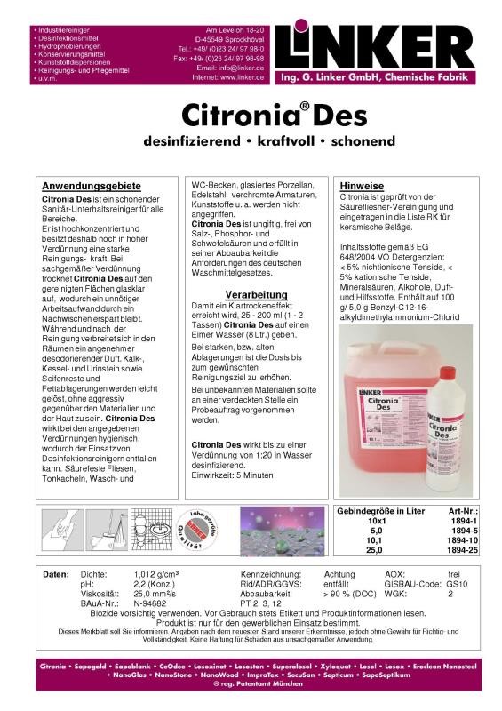 - Beschreibung Linker Chemie Citronia® Des - Sanitär-und Küchenunterhaltsreiniger 10,1 Liter Er ist hochkonzentriert und besitzt deshalb no… Mehr