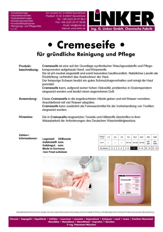 Cremeseife ist eine auf der Grundlage synthetischer Waschgrundstoffe und Pflegekomponenten aufgebaute Hand- und Körperseife. Sie ist pH-neutral eingestellt und somit besonders hautfreundlich. Natürliches Lanolin als Rückfettung verhindert das Austrocknen der Haut. Der feinporige Schaum besitzt ein gutes Schmutztrageverhalten und reinigt die Haut porentief. Cremeseife kann, aufgrund seiner hohen Viskosität, problemlos in Dosierspendern eingesetzt werden und besitzt einen angenehmen Duft.