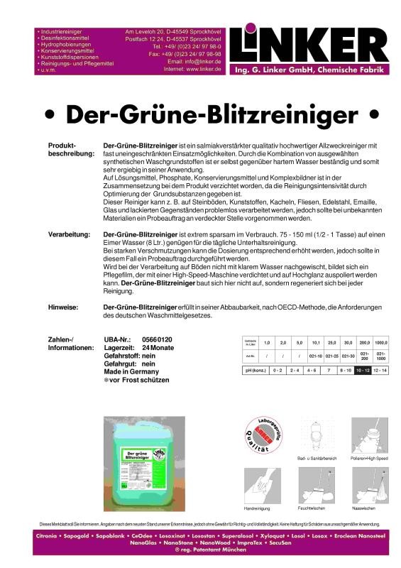 - Beschreibung Linker Chemie Der grüne Blitzreiniger Allesreiniger 10,1 LiterSalmiakverstärkter qualitativ hochwertiger AllzweckreinigerPro… Mehr