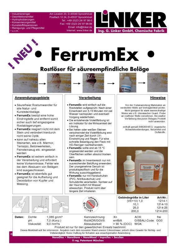 FerrumEx ist ein Säurefreier Rostumwandler für alle Natur- und Kunststeinbeläge. FerrumEx besitzt eine hohe Eindringtiefe und entfernt somit sicher auch tief eingezogene Rostablagerungen.