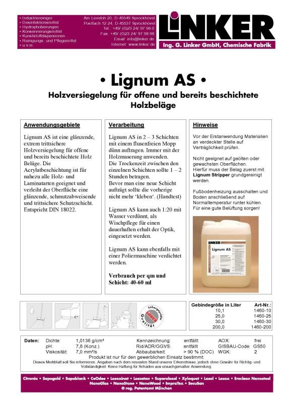 - Beschreibung Linker Chemie Lignum AS glänzende Holzversiegelung trittsicher 10,1 LiterHolzversiegelung für offene und bereits beschichtet… Mehr
