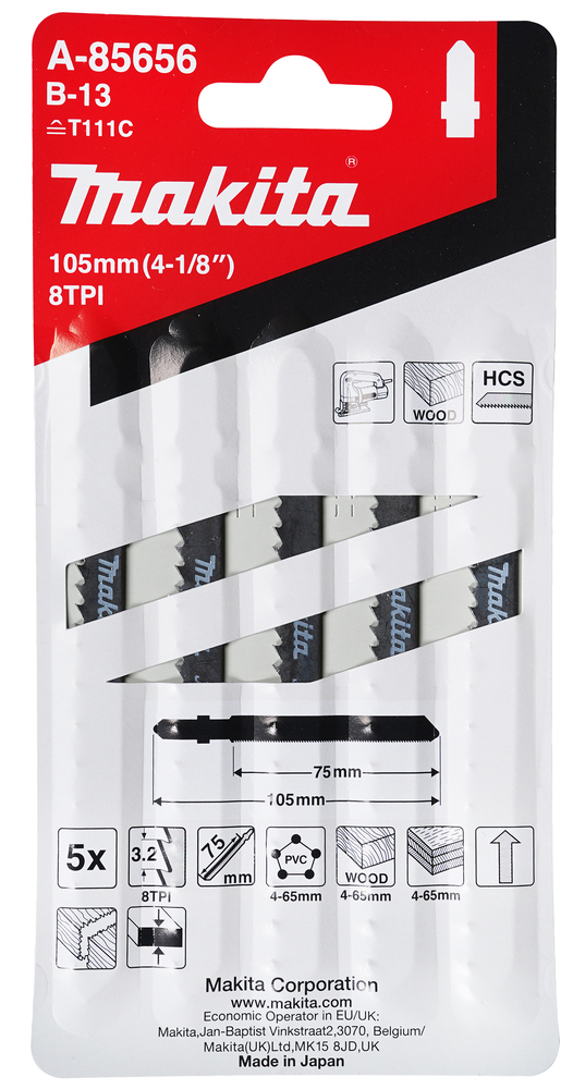 - Beschreibung Makita Stichsägeblätter B-13 (5 Stück) A-85656Weichholz/Kunststoff • 3,2 mm / 8 tpi • Arbeitslänge: 70 mm • 5 StückStichsäge… Mehr