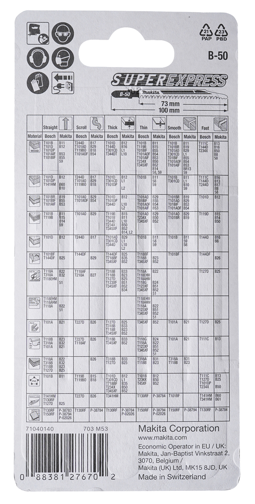 - Beschreibung Makita Stichsägeblätter Typ B 50 B-06460Holz/Kunststoff • 2,4 mm / 10 tpi • Arbeitslänge: 73 mm • 5 StückStichsägeblatt B-50… Mehr