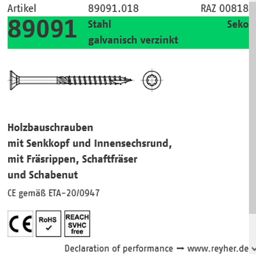 - Beschreibung Reyher Holzbauschrauben SeKo galvanisch verzinkt TG 8x220 mm Innensechsrund T40 (50 Stück).