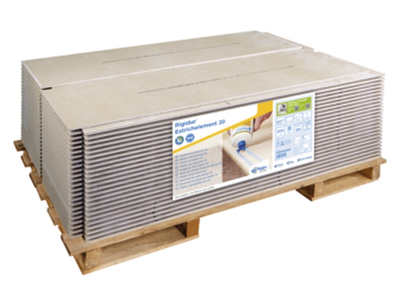 Rigips Rigidur Estrichelement 1500 x 500 x 20 mm. 2x10 mm. Trockenestrichelement mit Stufenfalz aus zwei werksseitig miteinander verbundenen, grundierten Gipsfaserplatten. Element: 0,75 qm.