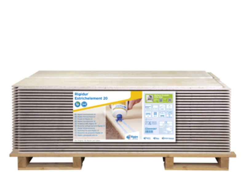 Das Rigidur Estrichelement 20 von Rigips besteht aus vorgrundierten Gipsfaserelementen mit Stufenfalz ohne unterseitige Kaschierung. Es verfügt über eine extrem harte und glatte Oberfläche.